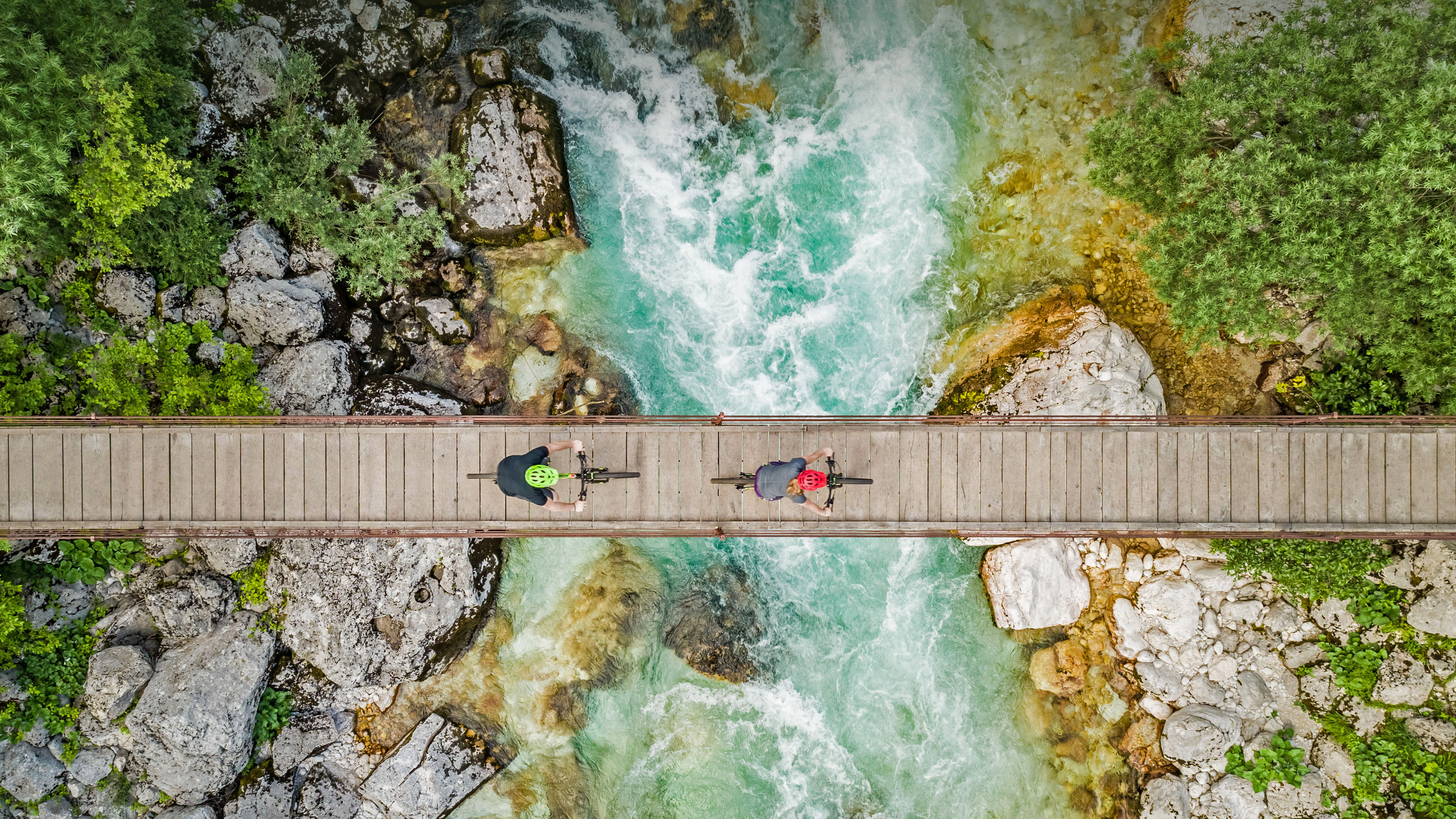Cyclists on a wooden suspension bridge over the Soča River in Slovenia (© Amazing Aerial Agency/Offset by Shutterstock)